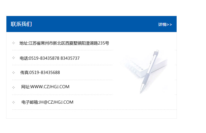 地址:常州市新北區友邦商務大廈1幢16、17層  電話:0519-85101652  傳真:0519-85112595  郵編:213022  網址:www.cz-jiayue_cn.szhqgp.com  郵箱:xiajifengaa@163.com